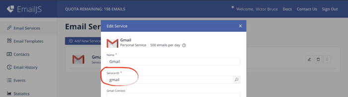 3. Configure the services by providing a name and a service id. In this example, I used Gmail for the name and gmail for the service id.