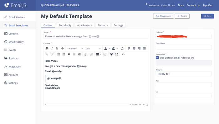 3. Modify the default template provided by EmailJs to suit the contact form you have created.