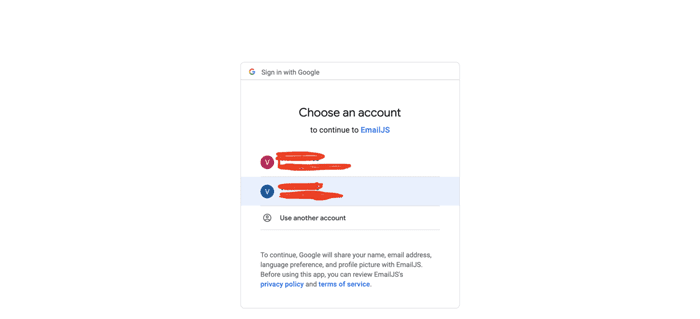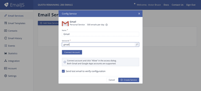 4. Next, click on the connect button to choose a Gmail account to connect with and grant EmailJs permission to send an email on your behalf.