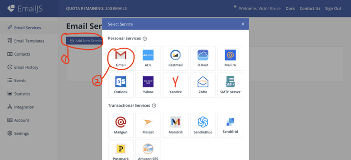 Log in to your newly created account with the email you registered the account with and a password. On your dashboard, navigate to Email Services to add an email service. EmailJs supports a variety of email services, both transactional and personal email services. Examples of personal email services supported are Gmail, Outlook, Yahoo, iCloud, SMTP server, etc. For transactional email services, EmailJs supports services such as SendGrid, Mailgun, Mailjet, Amazon SES, etc.