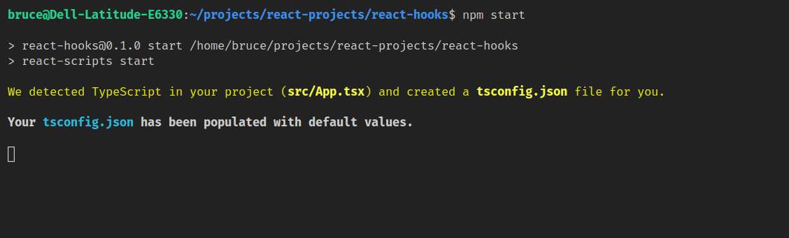 npm start. A prompt will show in your terminal notifying you that a tsconfig file has been set up and populated with default values.